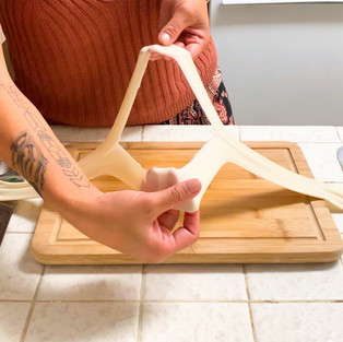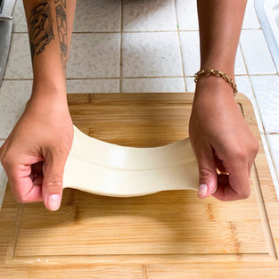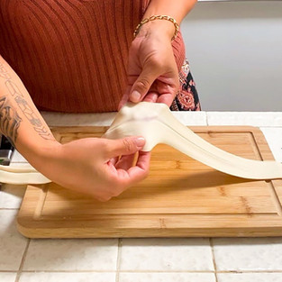 Take each side of the rectangle with your hand and start stretching. Smack the noodles on your working surface a few times.