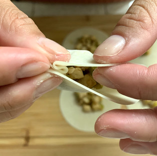 Using your finger add some water on the edge of the wrapper. This will seal your gyoza and prevent them from opening when they steam.