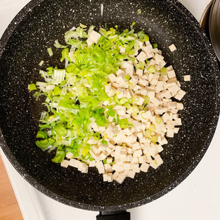 Heat up some vegetable oil on medium heat in a large pan. Add your leak and tofu and cook it for a few minutes.